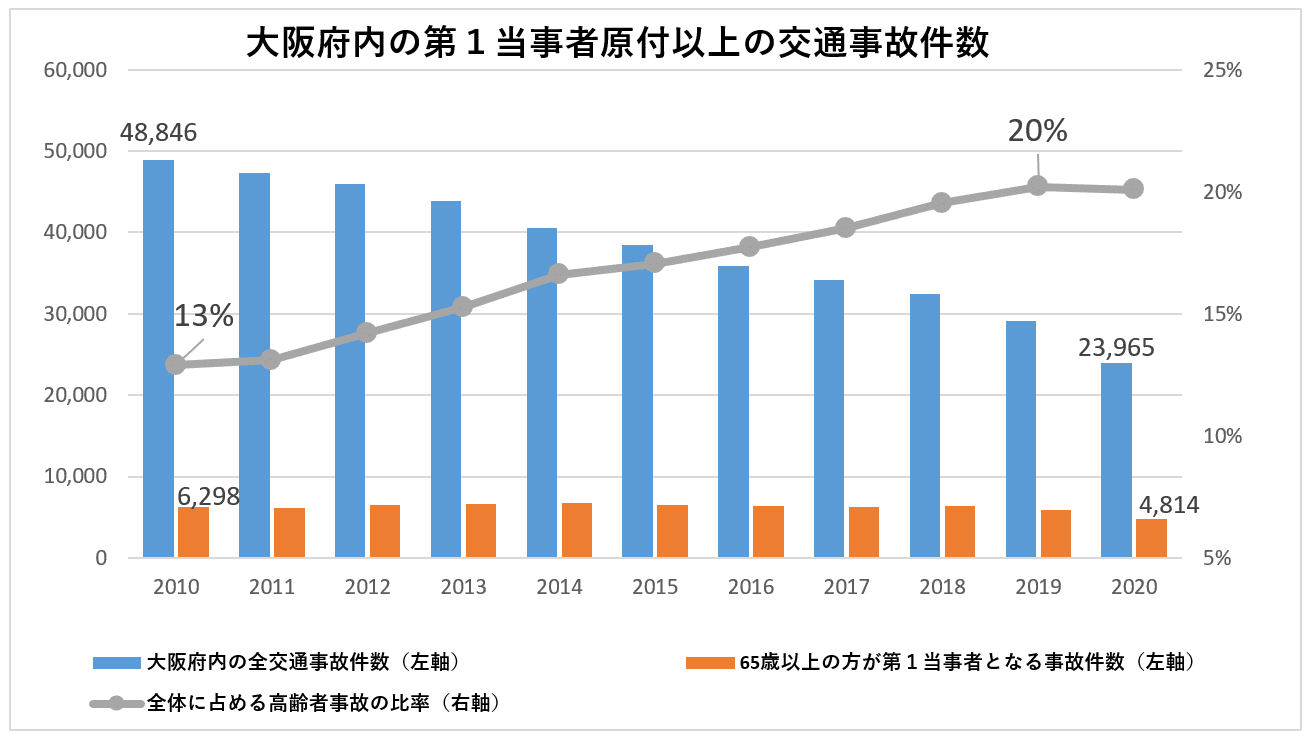 - 田中様:大阪府で発生した交通事故の件数は、10年前は約4万9000件だったのに対して、昨年は約2万4000件と半減しています。しかし高齢ドライバーが起こした交通事故の件数に関しては、10年前の約6300件から約24%しか減っていません。結果として交通事故全体の中で占める高齢ドライバーの事故の割合は、12.9%から20.1%へと増加しています。